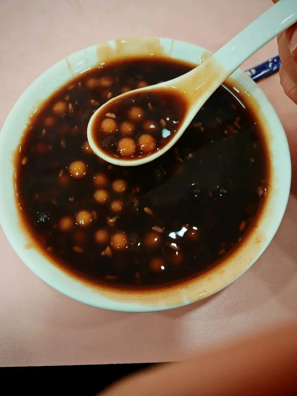 打包带走吃的,这个汤就是上面说的加藕粉加的很多的了,几乎是相当浓稠,然后里面是芋艿块,汤是用红糖熬的。