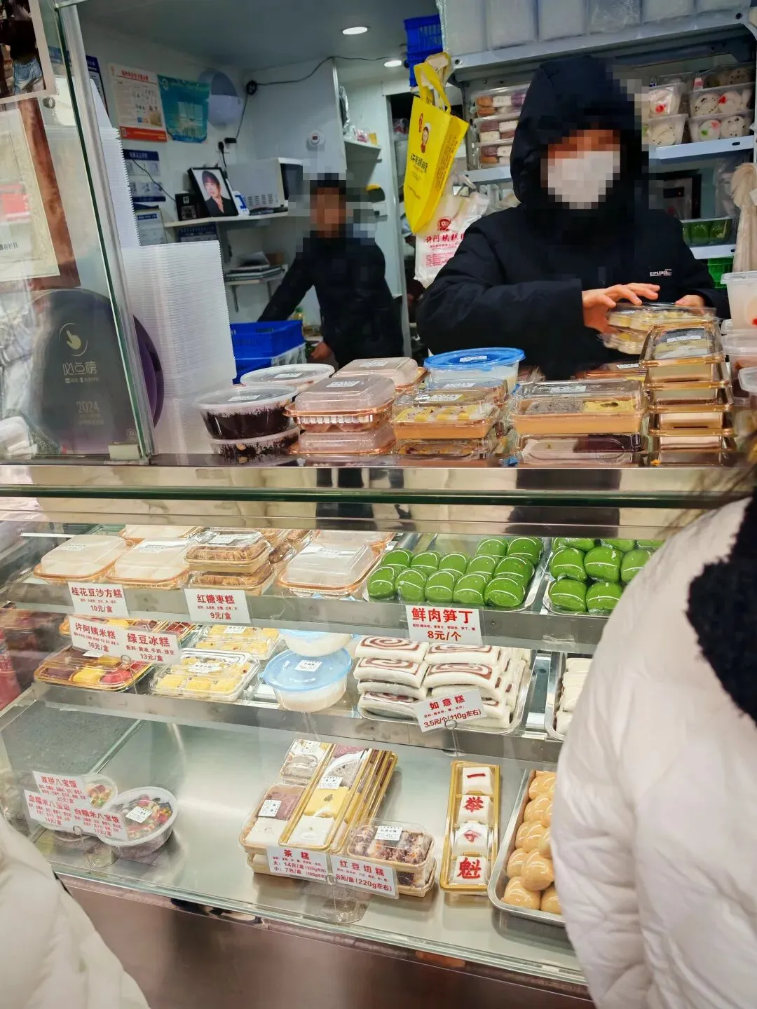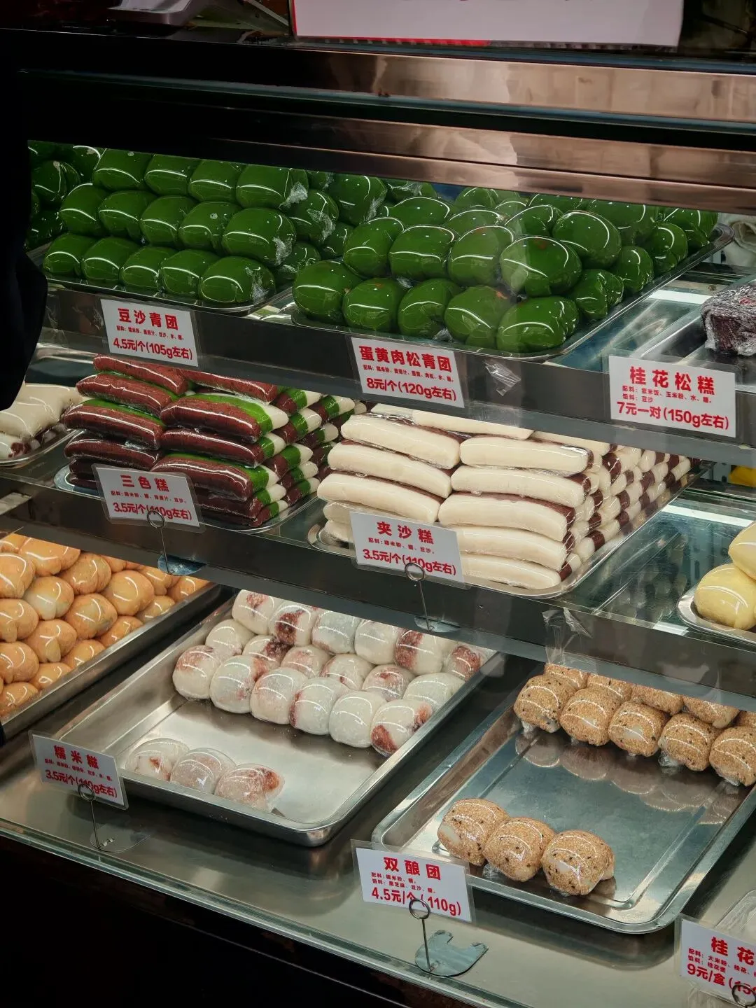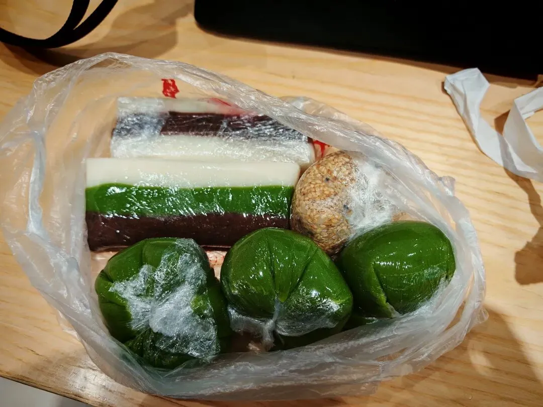 刚刚那个肉夹馍的旁边有这么一家馄饨元宵店,我不太想在这一家店吃馄饨,准备到另外一家店去吃,但是他门前摆的一大锅赤豆元宵吸引住了我。 赤豆元宵,也是南京小吃中的名品,我最喜欢了,用红豆熬的小圆子,经常是这种铜锅,与江苏其他地方的不太一样,南京的赤豆元宵普遍要加一点藕粉,并非是纯靠红豆熬出来的浓稠。口感各有千秋,我都喜欢。但加的藕粉也就是一点,汤整体来说还是稀的,只是稍微勾一下芡的程度,并不像糖芋苗那种加的那么多。 继续往前走,见到了这个许阿姨糕团店,这个在南京也是名气很大的一家店,我以前去过他最老的那家店,这个茶南店还是第一次来,反正卖的东西是一样的。看起来很新鲜,很棒。 之前在上海杭州的经验告诉我,这东西不能买多了,买多了吃不完。 青团买了蛋黄肉松,豆沙和芝麻的各一个,然后是夹沙糕,双酿团和三色糕。 中午路过一杯喜茶,进去点了一杯碎银子黑糖啵啵,然后吃了一个蛋黄肉松的先,跟网上卖的那种完全密封好的是不一样的口感,而且这个馅给的超级足,很新鲜,非常好吃。