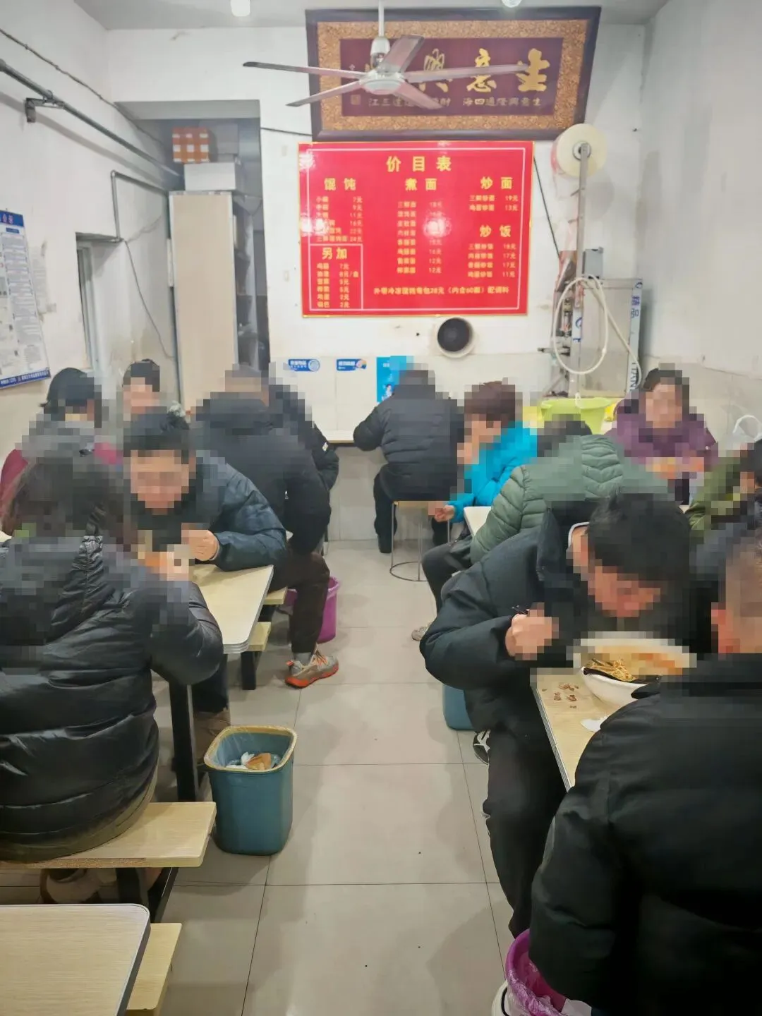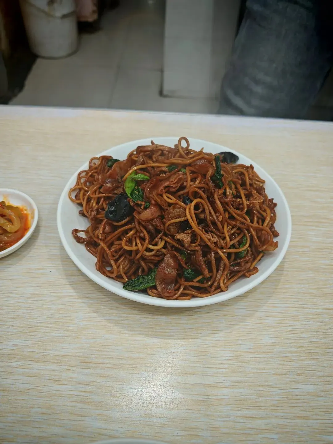 面条看着也可以,我看别人的汤面都好大一碗,15块钱上下。店很受欢迎,座位都是拼着坐的。对面一大哥的炒面看着不错,偷拍一下,还送一小碟榨菜,如果想喝汤的话,可以问前面要一大碗加了调味与葱花虾皮的馄饨汤,这真不错。