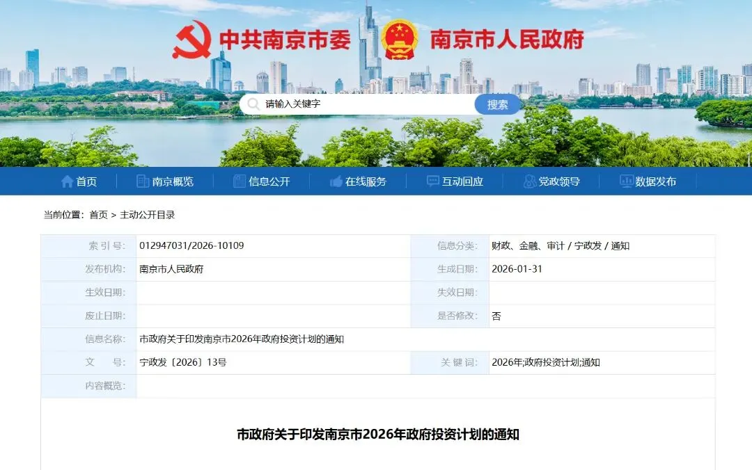 近日,南京市人民政府网站发布了《市政府关于印发南京市2026年政府投资计划的通知》。
