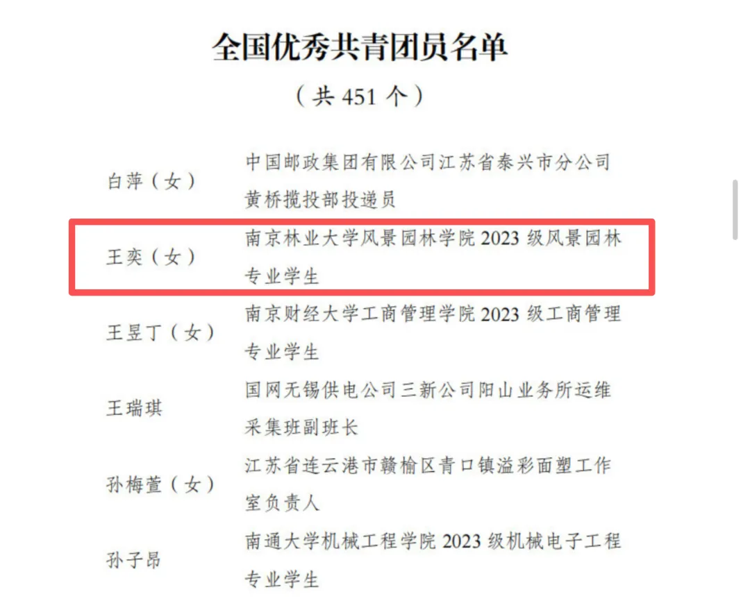 全国优秀共青团员2023级本科生王奕公示截图