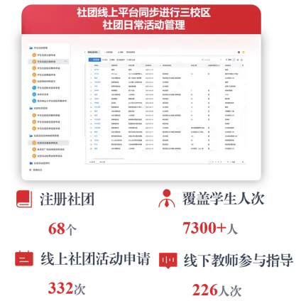 全面推进社团管理、指导教师考核数字化,线上服务覆盖率同比提升50%以上,管理效能显著增强。