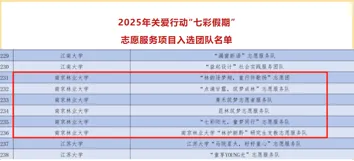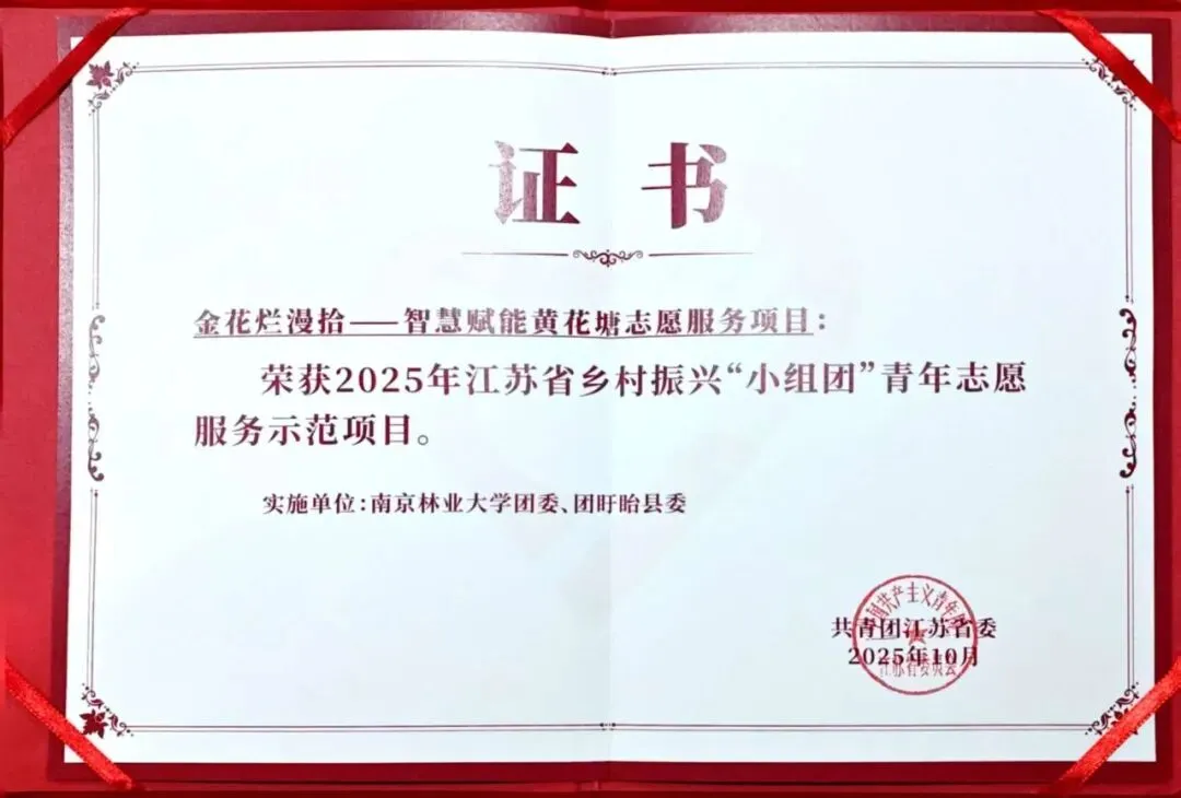 在2025年江苏省高校志愿服务项目大赛中,我校三支团队斩获1金2银;2个项目入选2025年江苏省“小组团”乡村振兴青年志愿服务示范项目。1个项目入围“美丽中国,志愿有我”生态环境志愿服务项目大赛国赛;在江苏省第四届“青绘乡村”青年文化创意设计大赛中学校获佳绩,获奖项目内容覆盖乡村文旅、产业包装、乡村产业规划等多个服务领域,展现了南林学子的创意与担当。