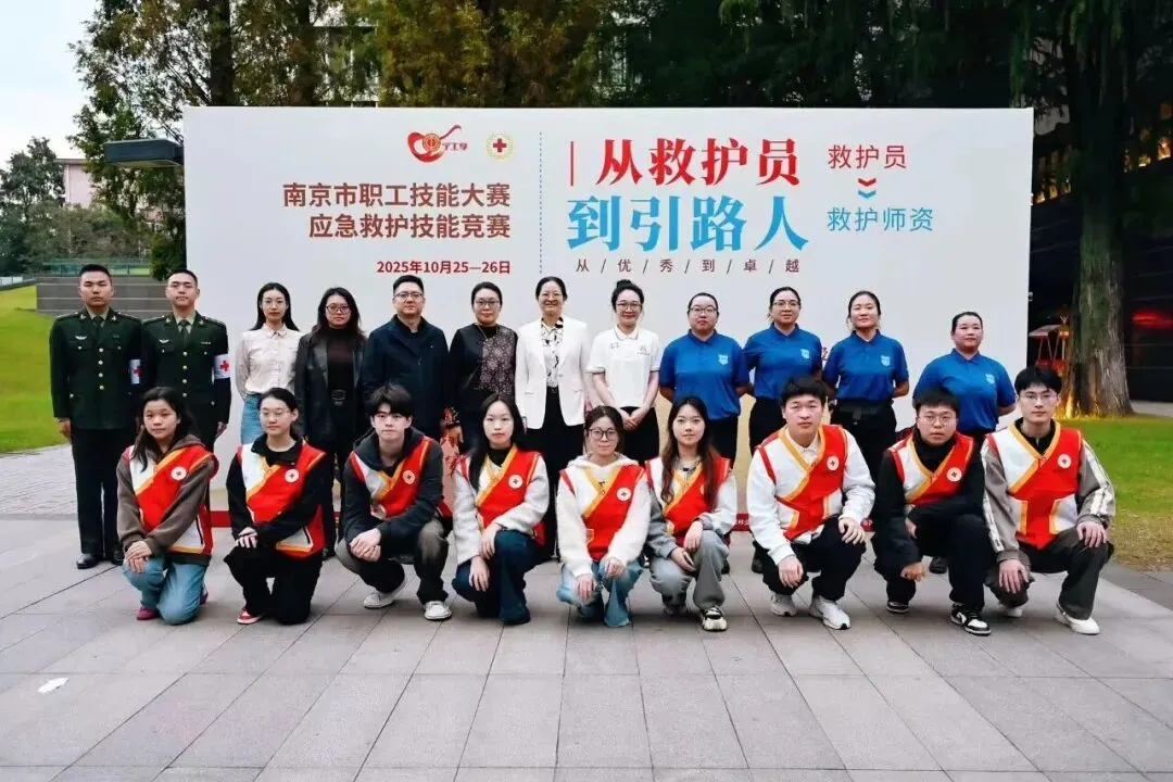 同时,还面向2025级一校三区8000名新生,将急救技能培训与军训工作有机结合,实现培训全覆盖且全员合格。依托新生急救技能培训的全覆盖基础,学校成功承办南京市职工技能大赛应急救护技能竞赛,实现教学与实践的双向提升。