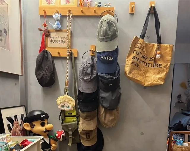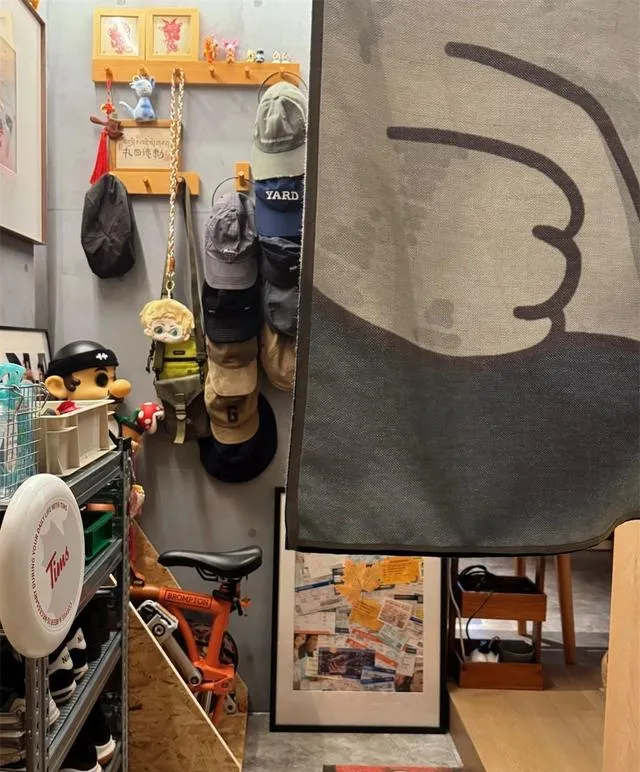 除了门帘,最让我在意的是这家的「垂直收纳」。你看墙面,门后,桌边,能挂的地方全挂满了。帽子、包、围巾、钥匙,甚至还有个小黄鸭挂件,全都在墙上找到了自己的位置。