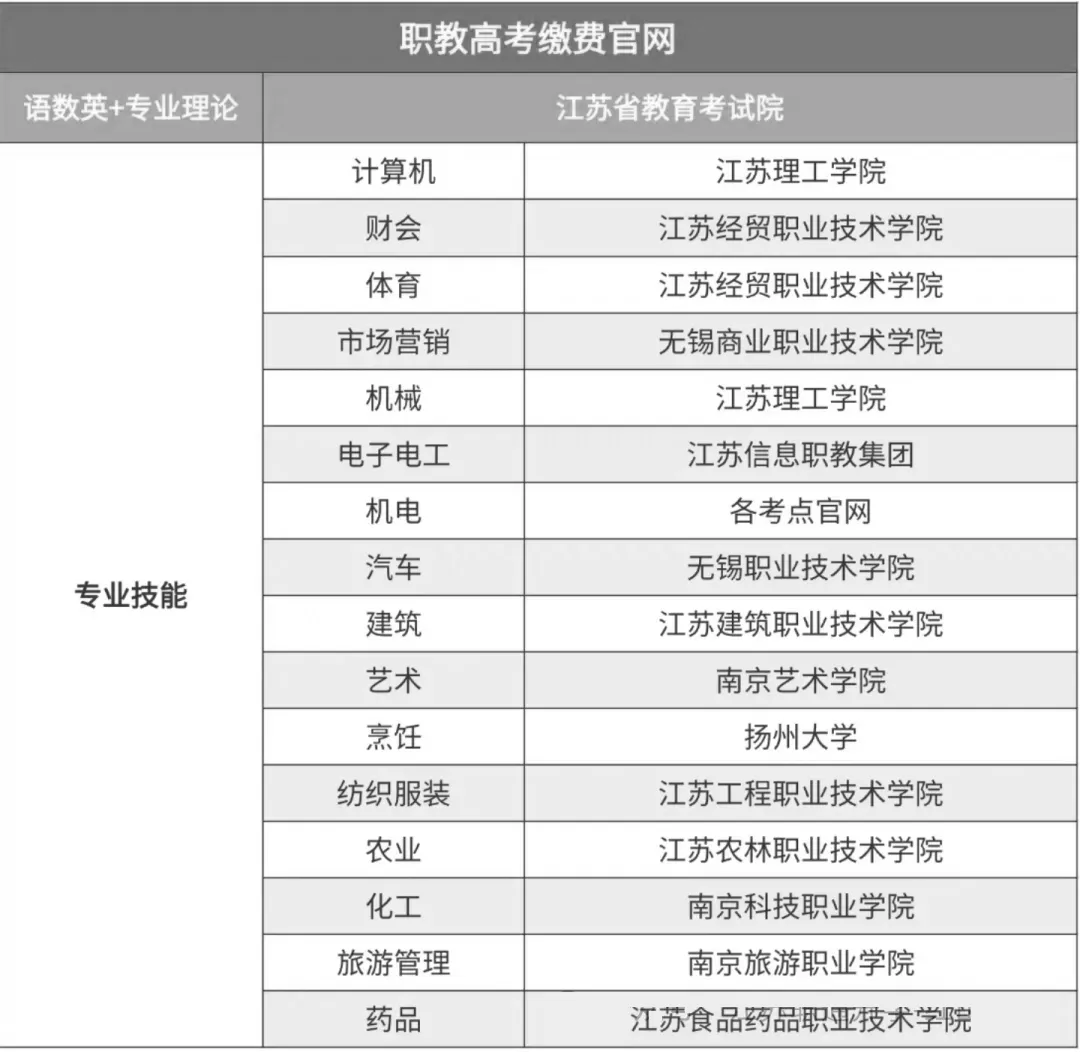 语文/数学/英语+专业理论 → 统一在江苏省教育考试院官网缴费;