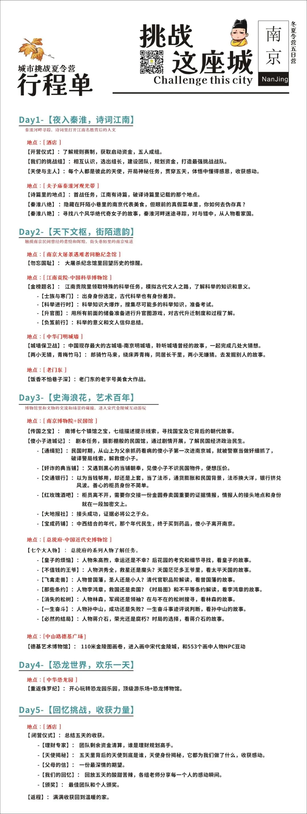 在各种结合城市的知识、文化的挑战中,进行团队资金管理、资源利用、人际交往、合作对抗、逆商训练...