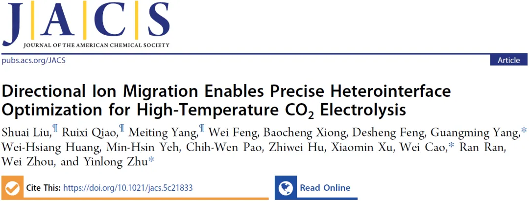 2026年02月05日,南京工业大学曹伟/杨广明、南京航空航天大学朱印龙团队合作在Journal of the American Chemical Society期刊发表题为“Directional Ion Migration Enables Precise Heterointerface Optimization for High-Temperature CO2 Electrolysis”的研究论文,南京工业大学Liu Shuai、南航Qiao Ruixi、南京工业大学Yang Meiting为论文共同第一作者,杨广明、曹伟、朱印龙为论文共同通讯作者。