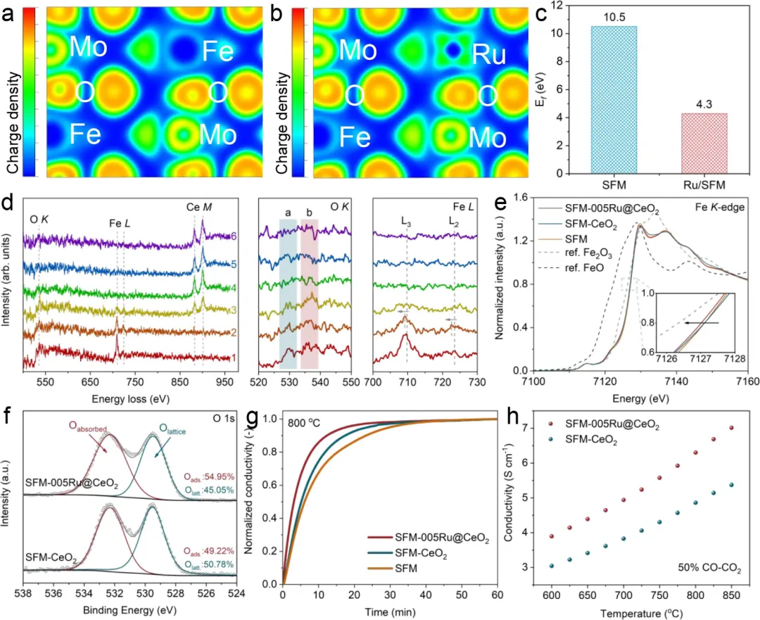 图3.异质界面活性位点的理论和实验鉴定。a,SFM-CeO₂和b,SFM-Ru@CeO₂(图1e中的L3)的二维电子局域函数。c,SFM和Ru/SFM表面的氧空位形成能。d,SFM-005Ru@CeO₂的EELS谱,显示了OK边、FeL边和CeM边。e,SFM、SFM-CeO₂、SFM-005Ru@CeO₂及参比材料的归一化FeK边XANES谱。f,SFM-CeO₂和SFM-005Ru@CeO₂样品的O1sXPS谱。g,在800°C下,当气流从66%CO-CO₂切换至50%CO-CO₂时,SFM、SFM-CeO₂和SFM-005Ru@CeO₂的归一化电导弛豫曲线比较。h,SFM-CeO₂和SFM-005Ru@CeO₂在50%CO-CO₂气氛中、600-850°C温度范围内的电子电导率。