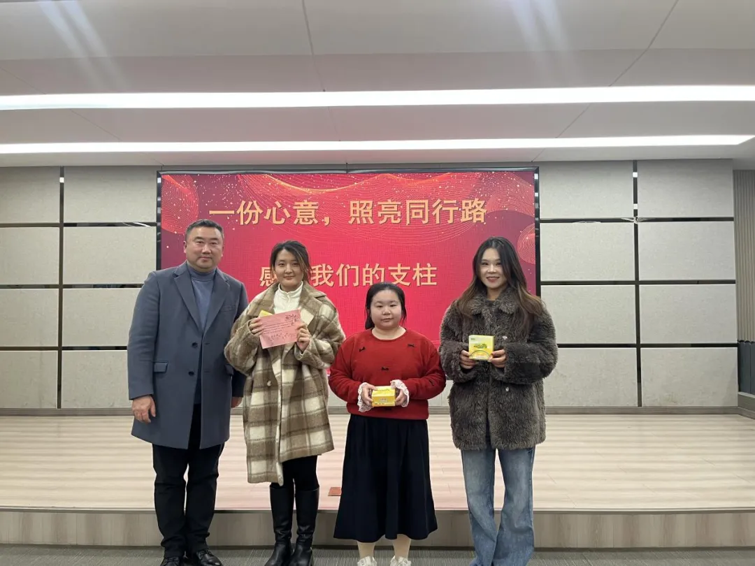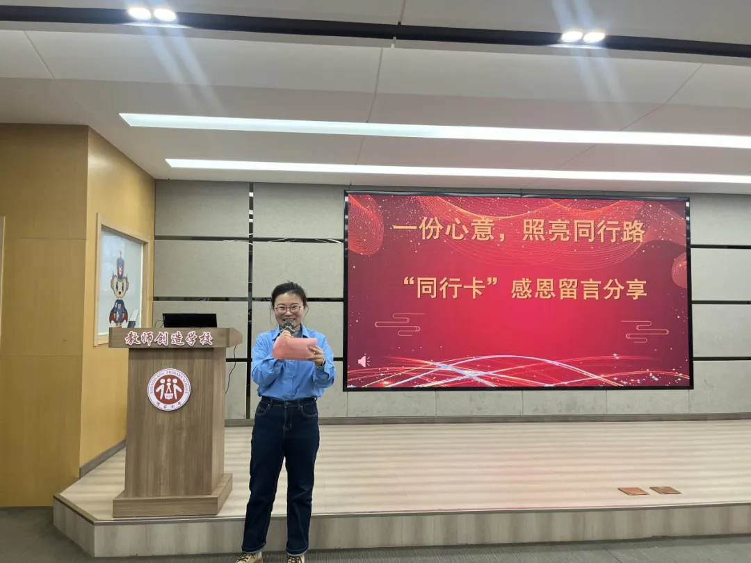 紧接着,“感恩同行”环节成为本次会议的情感高潮。会前,老师们撰写了“同行卡”,匿名表达对同事的感谢。现场随机邀请十位教师抽取并接龙朗读卡片内容,被感谢的教师逐一上台,接受象征希望与成长的“种子盲盒”。在“感谢我们的支柱”环节中,校长室三位校长上台依次抽取写给部门、团队、项目的“同行卡”。卡片中真挚的话语,道出了一线教师对默默奉献的支持团队的深深谢意。教师代表们上台接受全体教师的热烈掌声,接受象征希望与成长的“种子盲盒”。