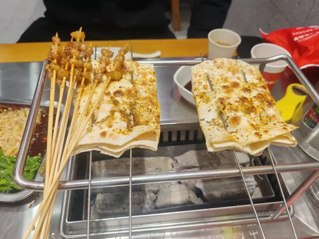 烤面饼表面被烤出一层酥脆的壳,内里却依旧保持着面食特有的柔韧与麦香。一口咬下,先是调料的辛香在舌尖炸开,紧接着是饼的焦脆与绵软交织的复杂口感。“烤肉筋” ,色泽棕褐油亮,嚼劲十足,脂肪与瘦肉在高温下交融,释放出质朴而浓郁的肉香。
