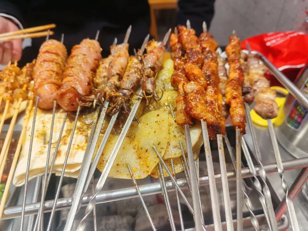 金黄的炸物串外酥里嫩;烤肠裂开嘴角,露出诱人的肉香;鱿鱼须焦香弹牙,带着海洋的咸鲜;薄切的土豆片烤得像薯片一样酥脆;各类肉串或焦香或嫩滑,统一的则是那深入肌理的炭火气息与香料风味。