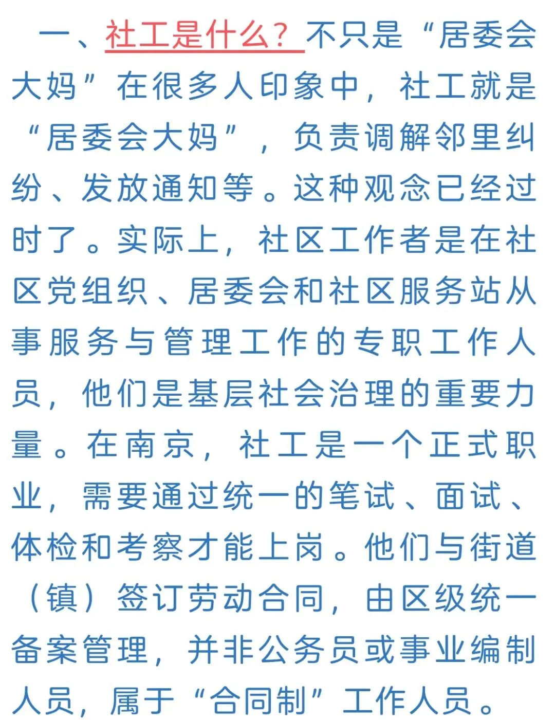 二、工作内容:基层“全科医生”南京社工的工作内容十分繁杂,可以比喻为社区“全科医生”,什么都要懂、什么都要管。主要包括:党建服务:协助社区党组织开展党员教育管理、组织生活、党建活动等。