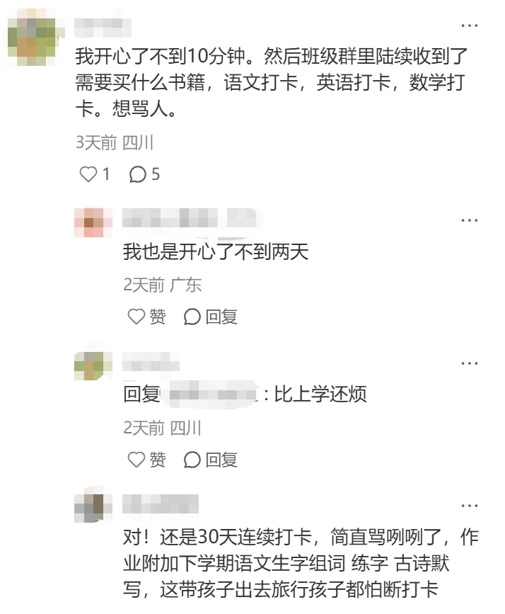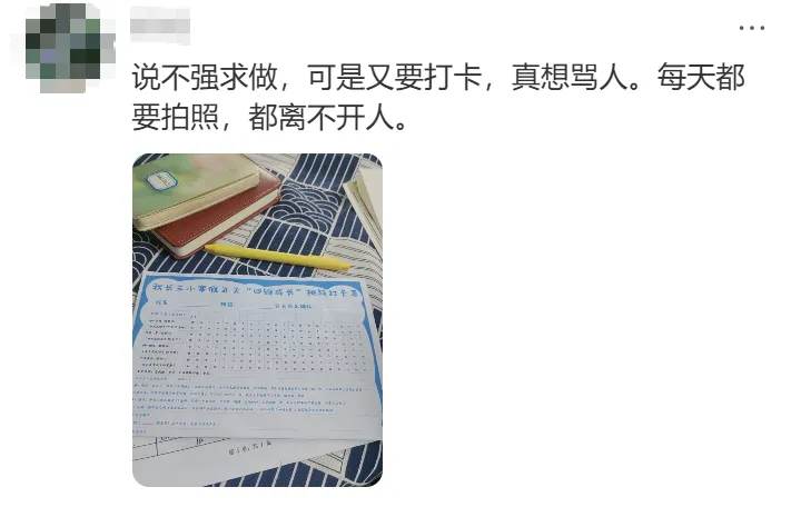 此外还有不少家长吐槽,书面作业就算了,最麻烦的是还要每天打卡上传到群里。