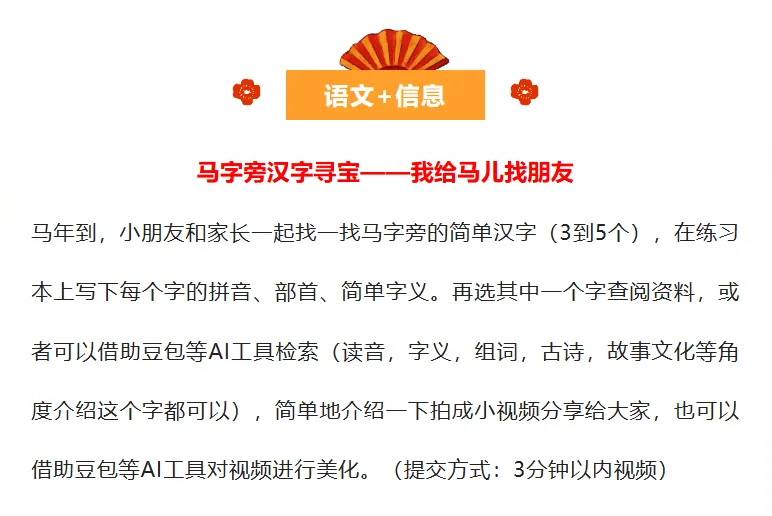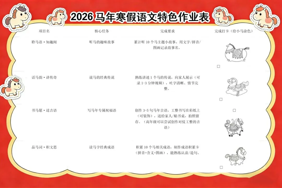 既有日常的基础学习要求,又有融合马年元素的德育实践。
