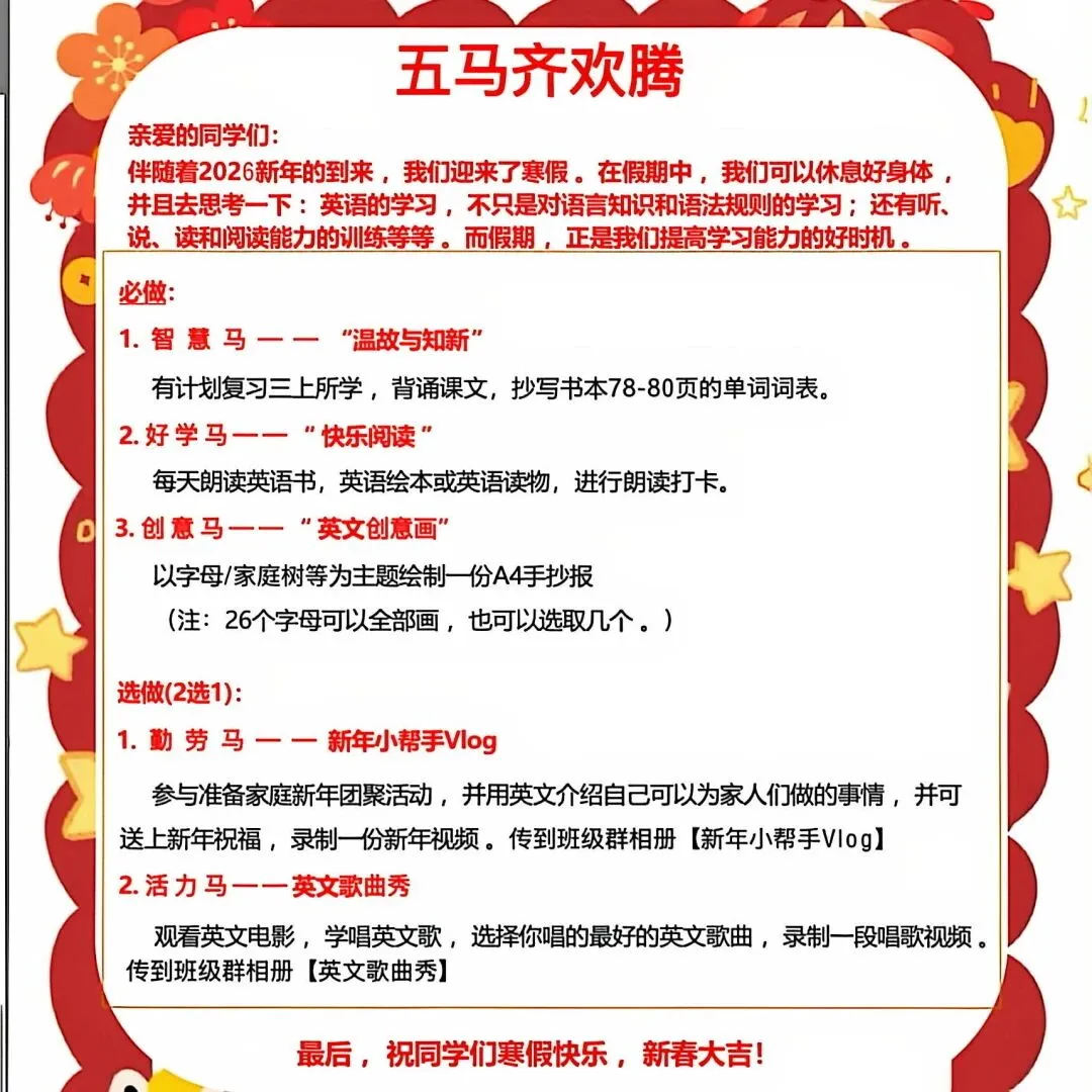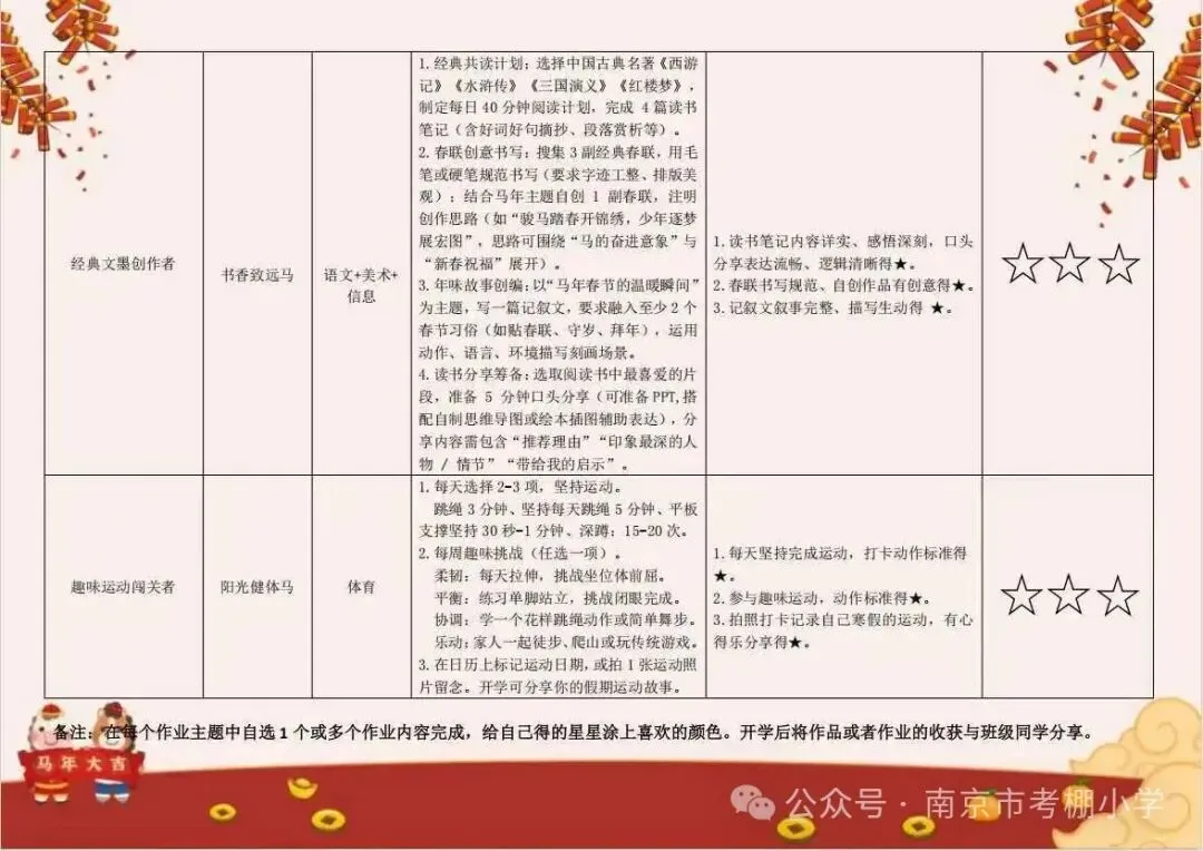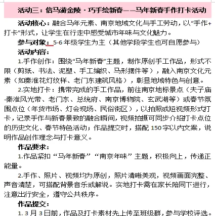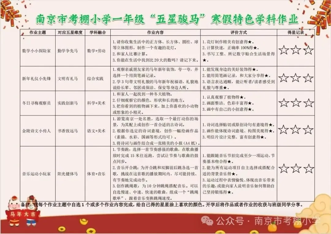 老师们精心设计的“五星骏马”寒假特色作业正式发布啦!本次作业围绕“德、智、体、美、劳”五大维度,融合多学科知识与南京本土文化,让大家在玩中学、做中悟。无论是用英语介绍南京传统节日,还是制作南京民俗主题插画,都能让孩子在实践中巩固知识、感知家乡魅力。