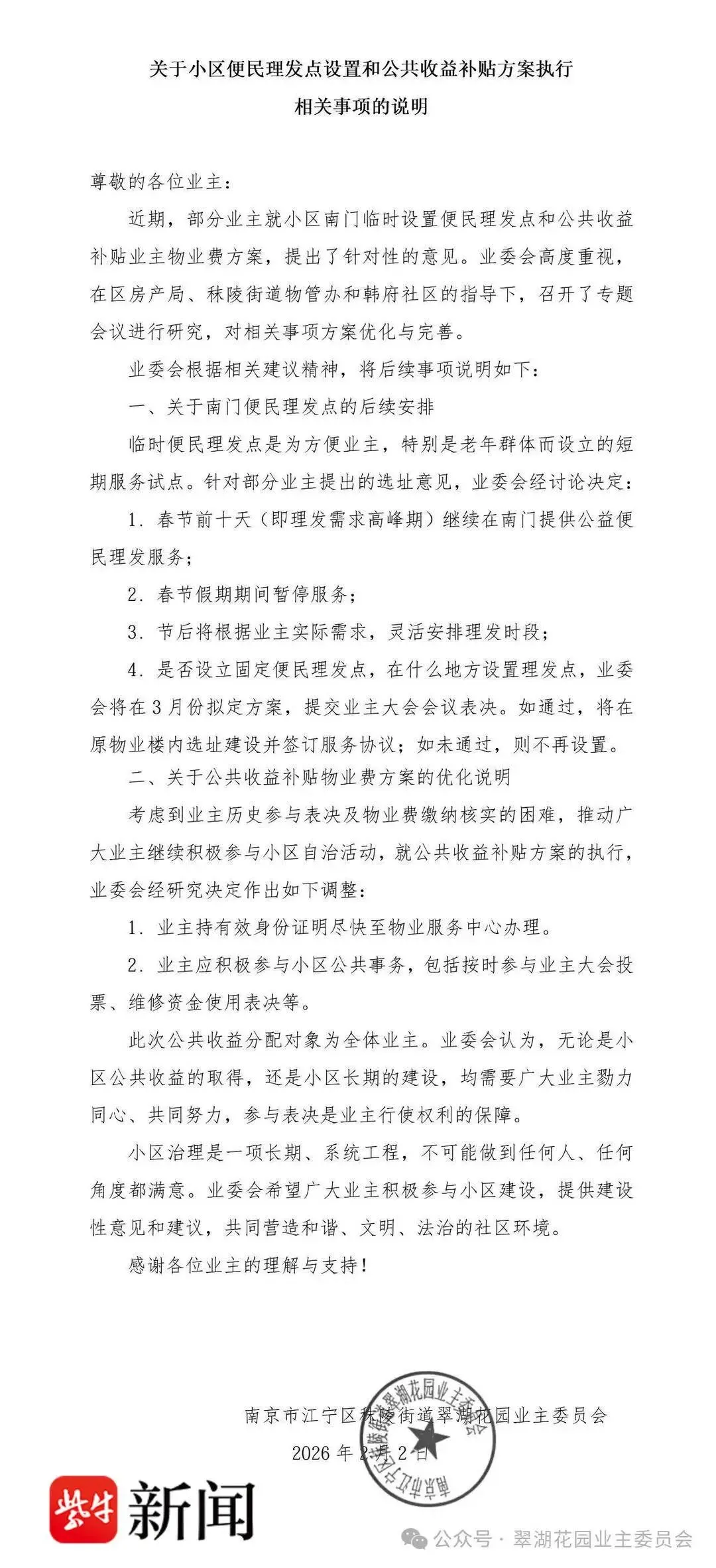 高主任还表示,针对近期业主的相关投诉,2月2日,由区房产局牵头,街道物管办、社区及小区业委会共同召开了专题协调会。他指着手机中2月2日发布的《说明》告诉记者,春节前,该“便民理发点”将继续在南门提供公益便民服务,居民可自愿付费。此外,业委会计划于2026年3月份启动全体业主意见征询工作,届时,便民理发服务点是否保留、具体选址何处,将完全根据业主投票结果决定。