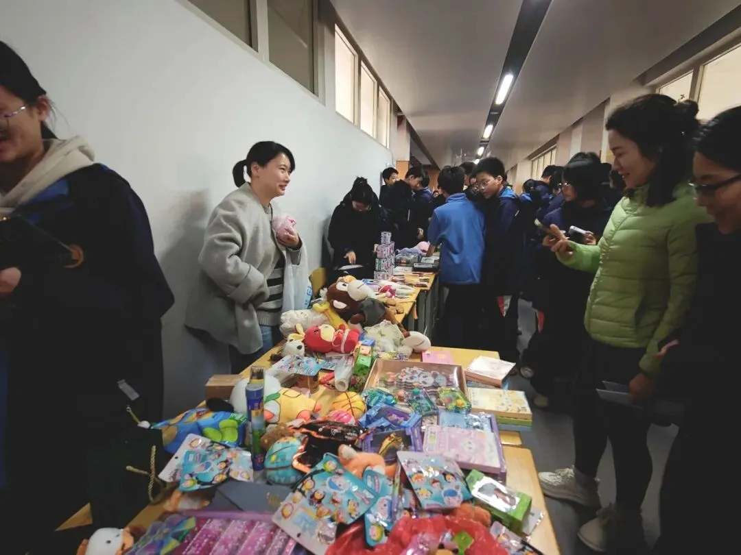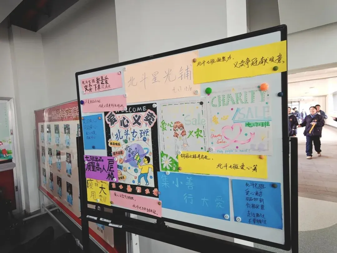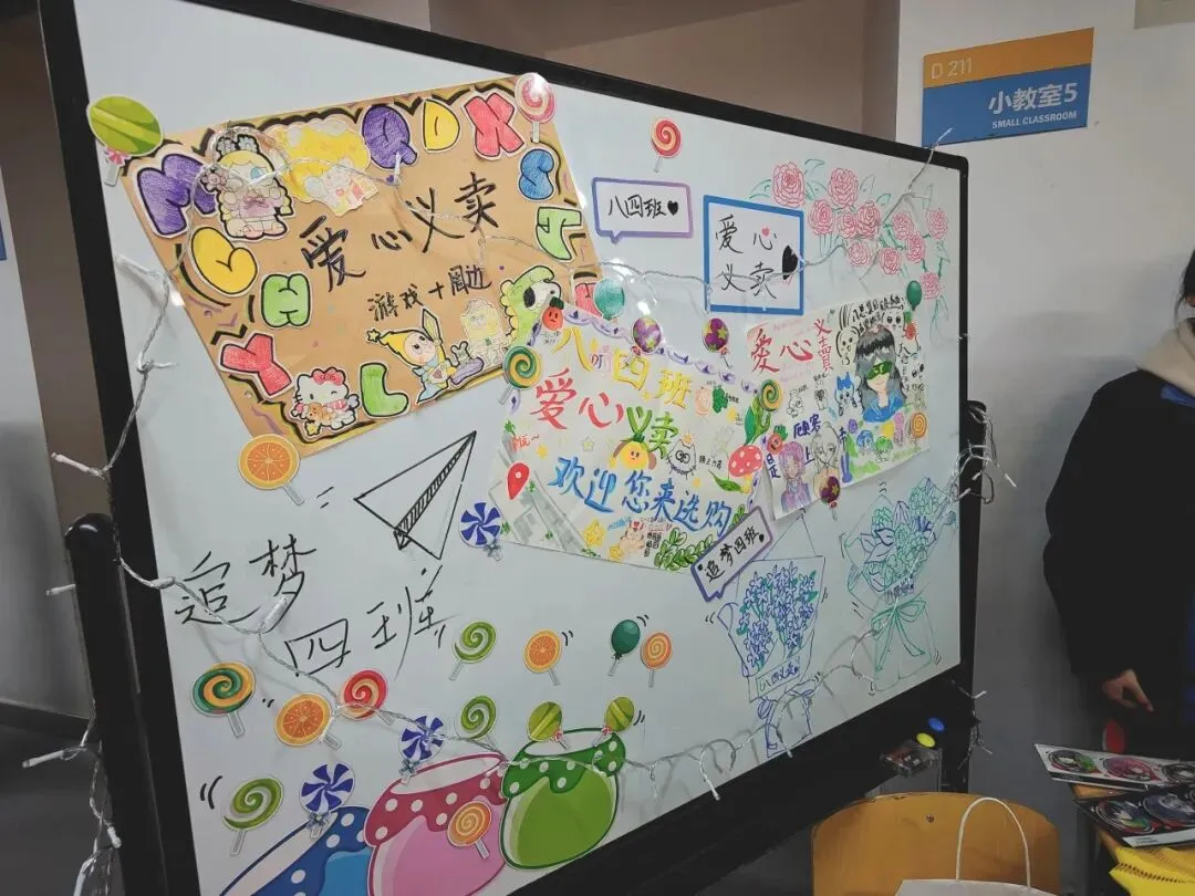 各班精心布置摊位,纷纷搬来桌布、软垫、桌椅等物品搭建专属“爱心店铺”。移动黑板成为现场的亮眼风景线,板面清晰标注“爱心义卖”字样、班级信息与创意店名,“星光小屋”“暖冬驿站”等暖心名称满含巧思,空余位置还细致介绍货品亮点,引得师生纷纷驻足关注。