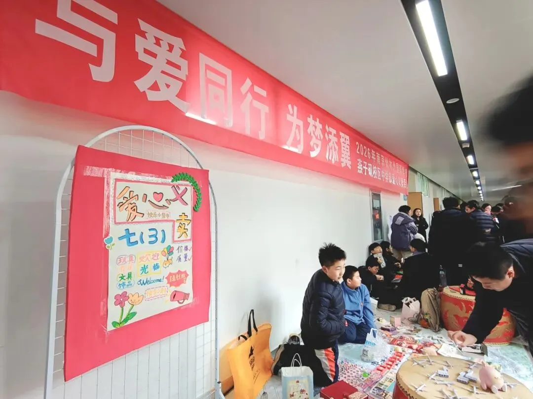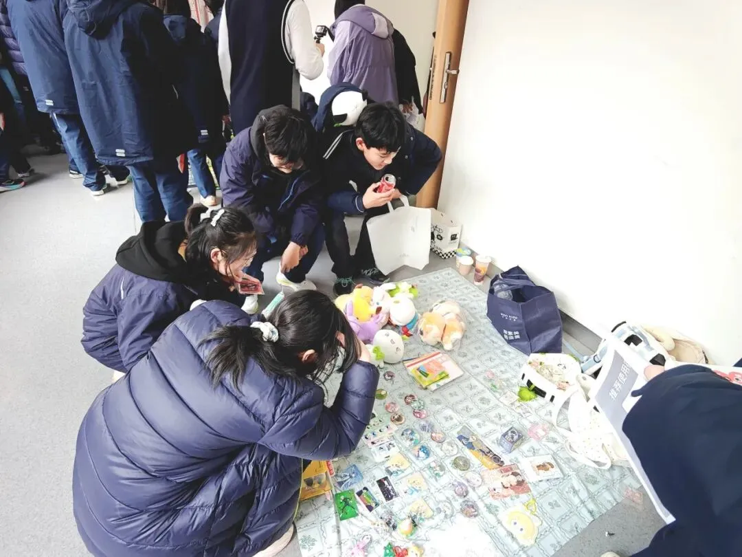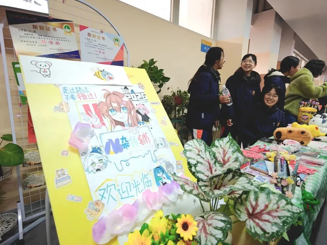活动前期,各班全力投入筹备工作。结合活动规划,初一年级以二楼音乐教室周边走廊及通道为主场地,部分班级延伸至教室内;初二年级以各班门口走廊为核心,辐射班级内部空间;大队委专属摊位设于初一 5班对面的图书角,各区域布局合理、错落有致,让二楼化作一片热闹的爱心集市。