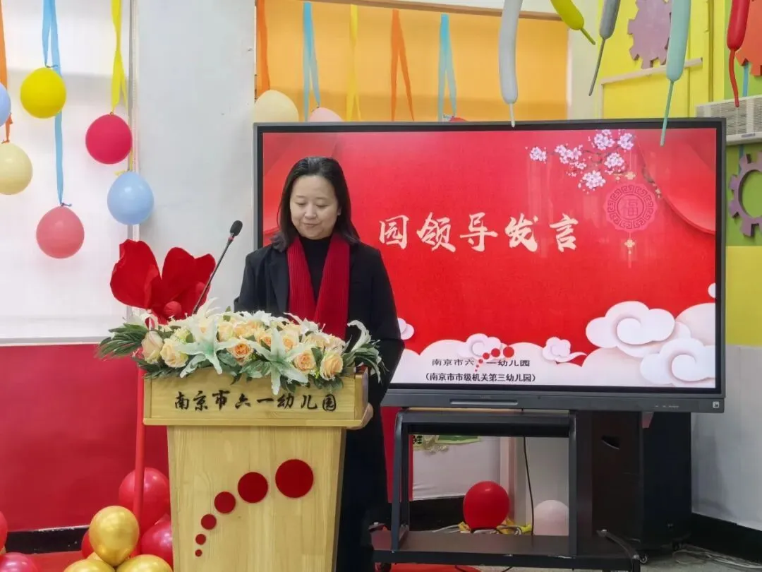 南京市六一幼儿园书记、园长王瑞发表深情致辞,感谢每一位教职工的辛勤付出与无私奉献,充分肯定了过去一年中大家在幼儿成长与园所发展方面的努力,并送上诚挚的新年祝福。期待在新的一年里继续携手,为孩子们的童心世界注入更多活力与美好。