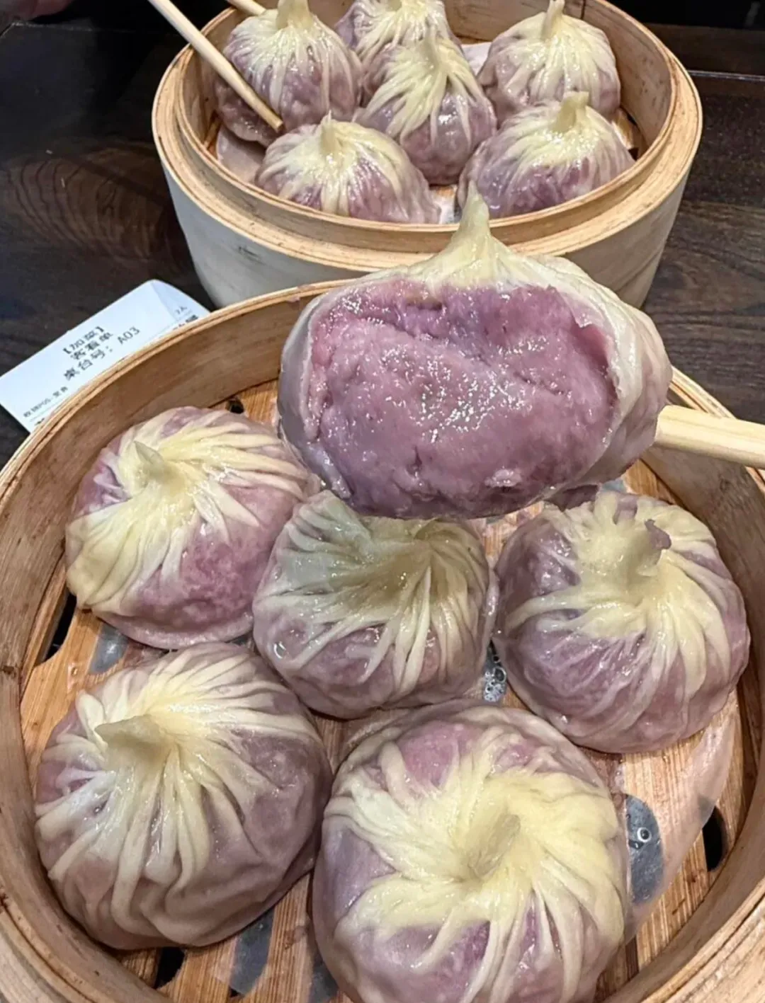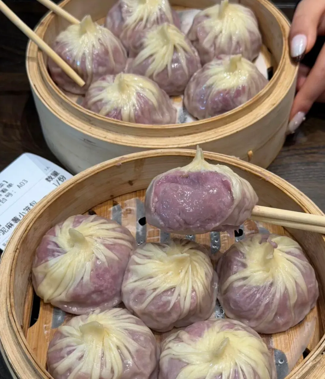 里面不是肉 , 是紫色的芋泥 , 还夹着一块软软黏黏的东西 , 应该是麻薯。我当时脑子有点转不过来 , 小笼包不是应该装肉的吗 , 怎么是甜馅。但是又很好吃 , 皮很薄 , 芋泥绵绵的 , 那个麻薯会拉丝。