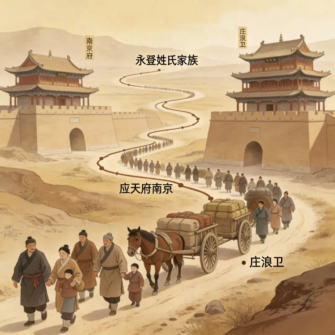 朝廷指令,核定身份。明廷依卫所戍边、实边垦荒、政治处置需求,从应天府核定迁移对象:军户由兵部调令、编入卫所军籍;谪迁家族由刑部定调、指定安置地;民屯民众由户部登记、核定屯种区域,均明确迁移目的地为庄浪卫(永登)及周边卫所/屯田点。