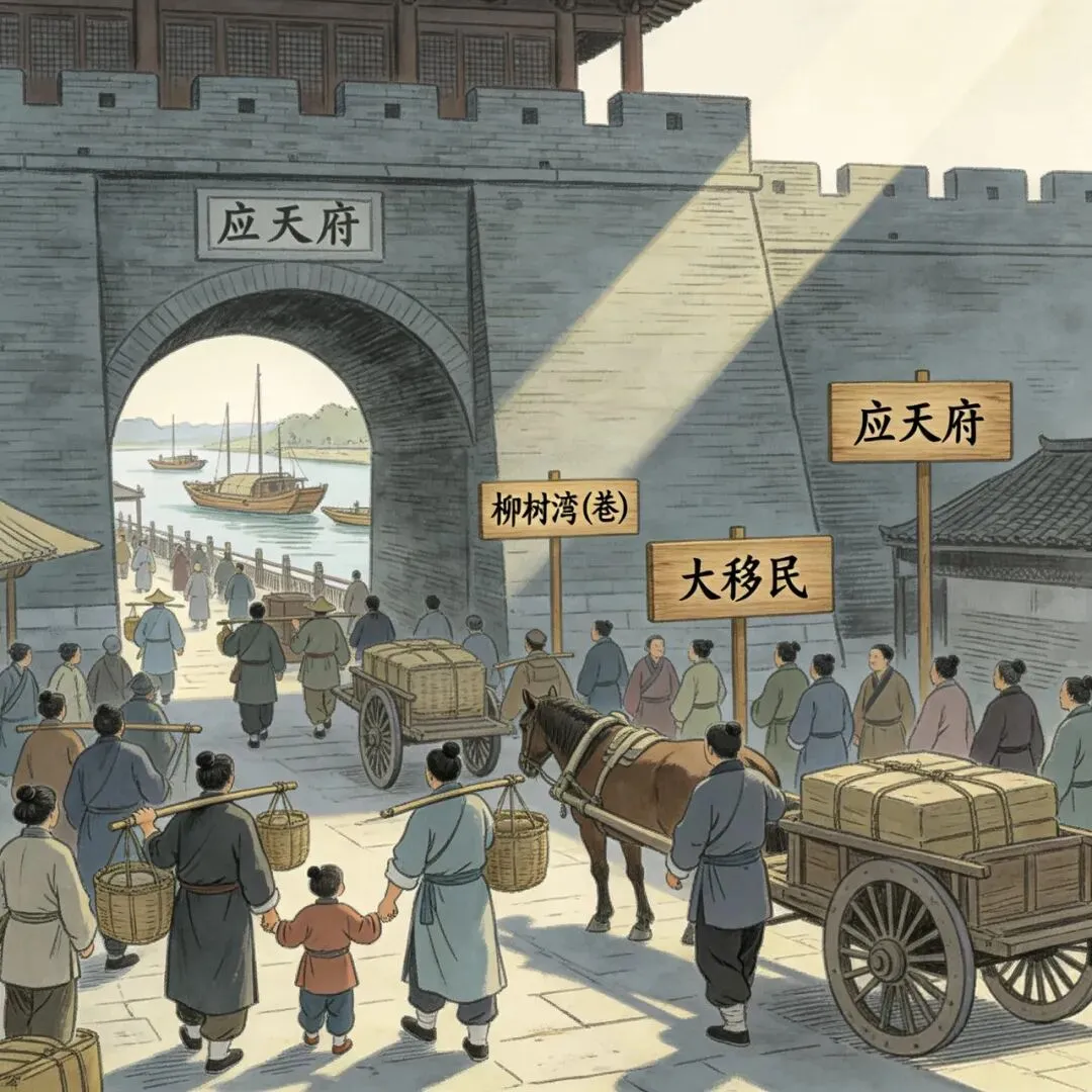定点集结,统一编组。迁移对象在应天府指定地点集结(如大柳树湾、金陵石桥),军户按军队建制编伍,携眷统一登记;谪迁、民屯家族按宗族/村落编组,由官差押送和引导,统一发放路引、口粮与迁徙物资。