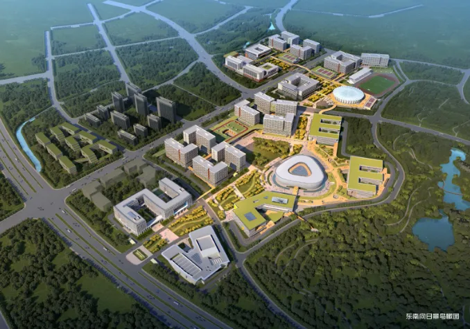 其中南区与一期新校区相邻,用地面积222191.43平方米,总建筑面积约41740.4平方米,包含地上建筑面积约32679.4平方米、地下建筑面积约9061平方米,主要建设行政办公楼、教学楼、看台等设施,建筑高度35.45米,绿地率达50%;