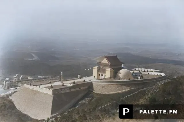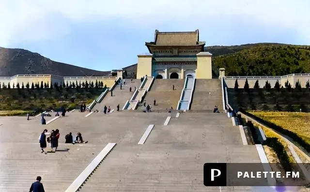 图中这座庄严的园陵就叫中山陵,山脊一压,台地一出,城垣式的围墙把气势托得稳稳的,青灰色的石台同琉璃顶一搭配,远远看着就透着肃穆,老人常说,登高一看城与山齐,心就静下来了。