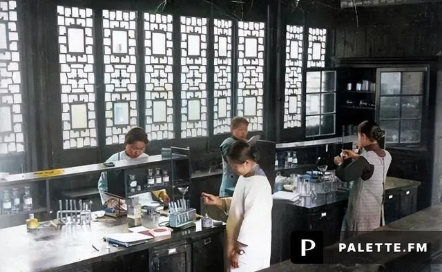 这间窗格细细的屋子叫校内实验室,试管架一排,酒精灯的火苗蓝得透亮,白瓷杯里泡着笔,姑娘们围着台面写写量量,老师拍了拍玻璃说,看,酸碱就这么变色,那个年头,学问靠手上做,桌面越旧越有劲道。