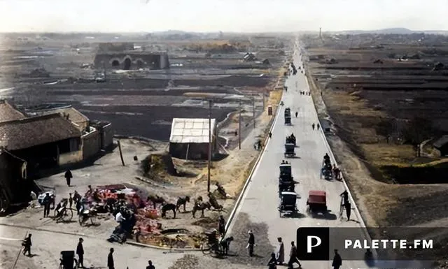 这条笔直的路叫郊外大道,马车和汽车混在一起跑,路边摊把篷一支,布匹红得刺眼,远处城门像个小黑点,以前出城半天一趟,现在导航一响,说拐就拐。