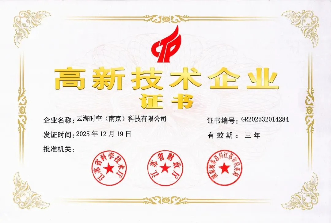 近日,云海时空(南京)科技有限公司顺利通过国家高新技术企业认定,标志着公司在自主研发能力、知识产权体系建设及科技成果转化水平等方面获得国家层面的权威认可。