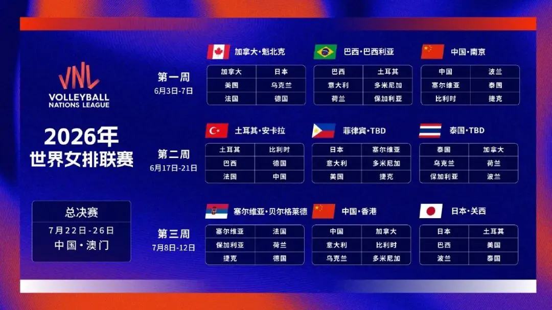 北京时间2月6日晚,国际排联公布了2026年世界排球联赛(VNL)分站赛赛程。中国六朝古都南京和文明古城临沂将分别承办世界女排联赛和世界男排联赛第一站比赛。中国女排将先后参加中国南京、土耳其安卡拉、中国香港站的比赛。中国男排将先后参加中国临沂、波兰格利维采、美国芝加哥站的比赛。本年度世界男排联赛总决赛再次落户中国宁波,世界女排联赛总决赛落户中国澳门。