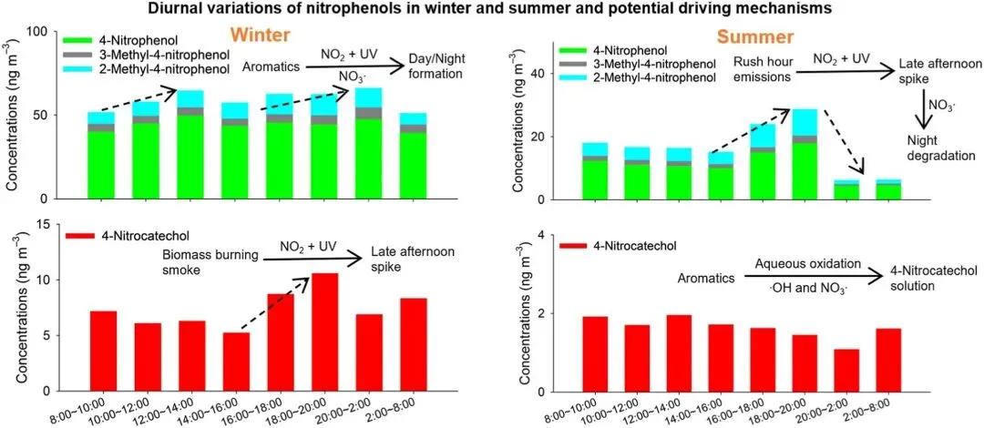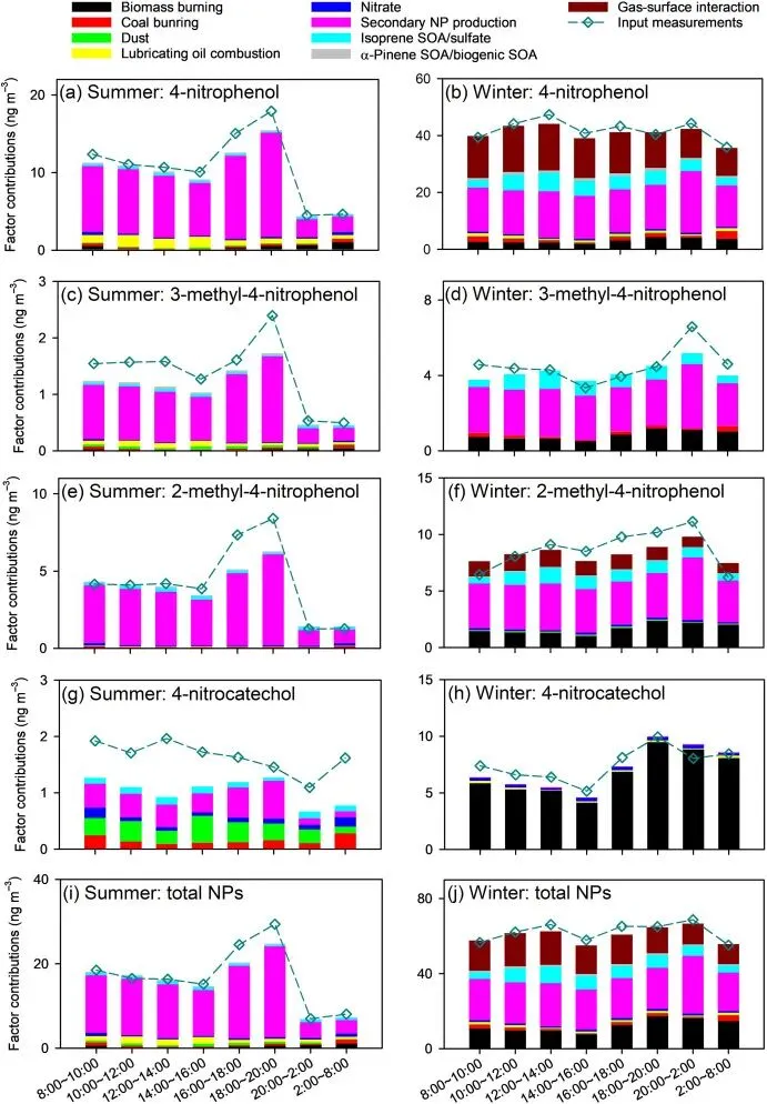 图4. 夏季和冬季各因子对硝基酚贡献的日变化堆叠图。