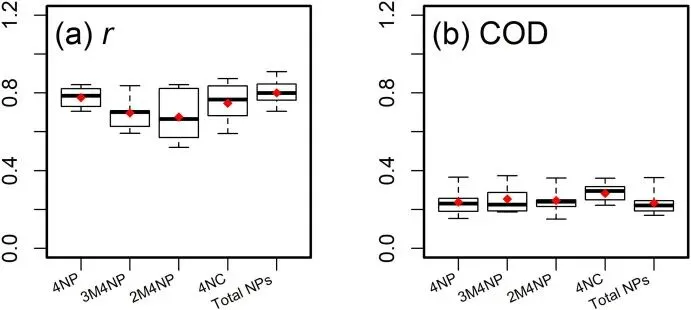 图1. 五城市采样点间硝基酚浓度的相关系数(r)和发散系数(COD)分布。