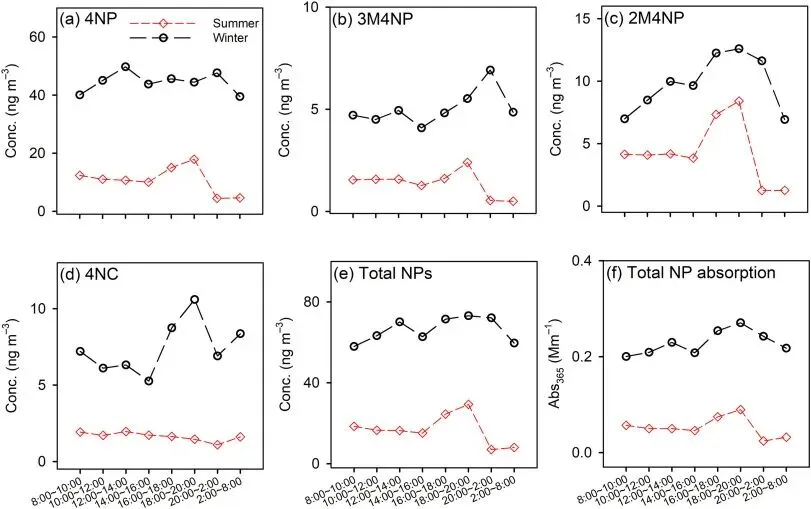 图2. 夏季和冬季PM2.5中硝基酚平均浓度及其对吸光贡献的日变化。
