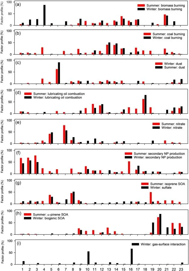 图3. 夏季和冬季PMF模型解析的归一化因子谱对比。
