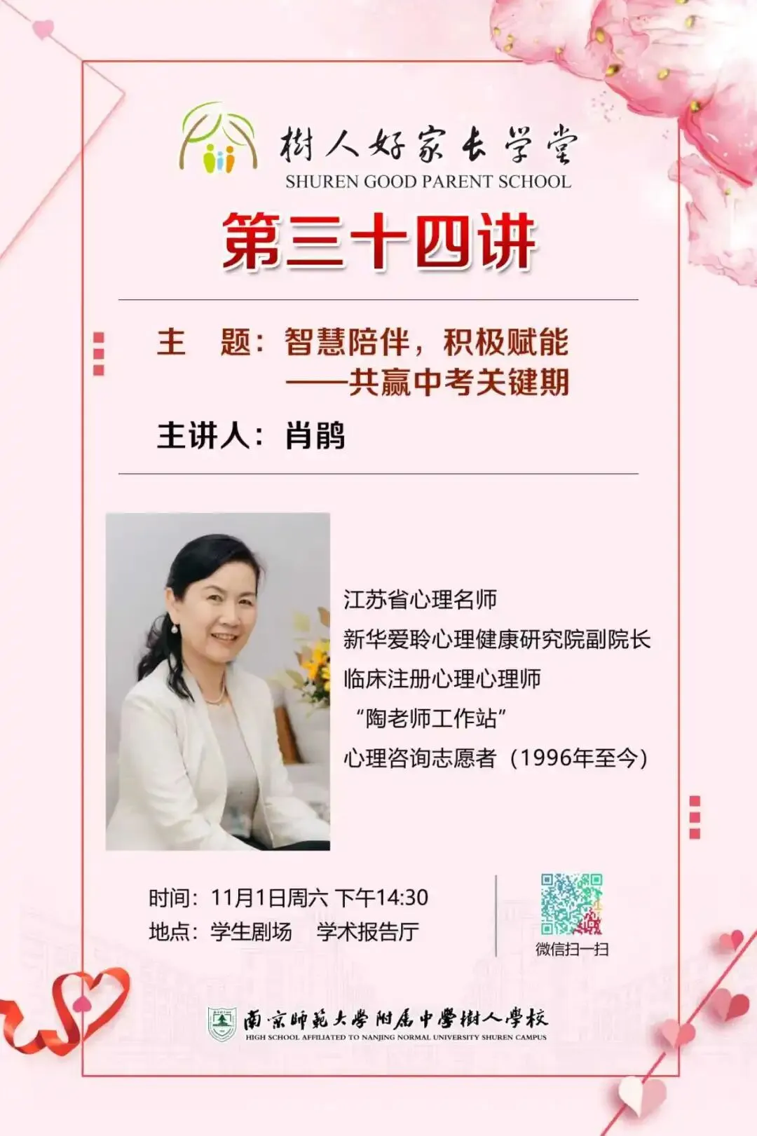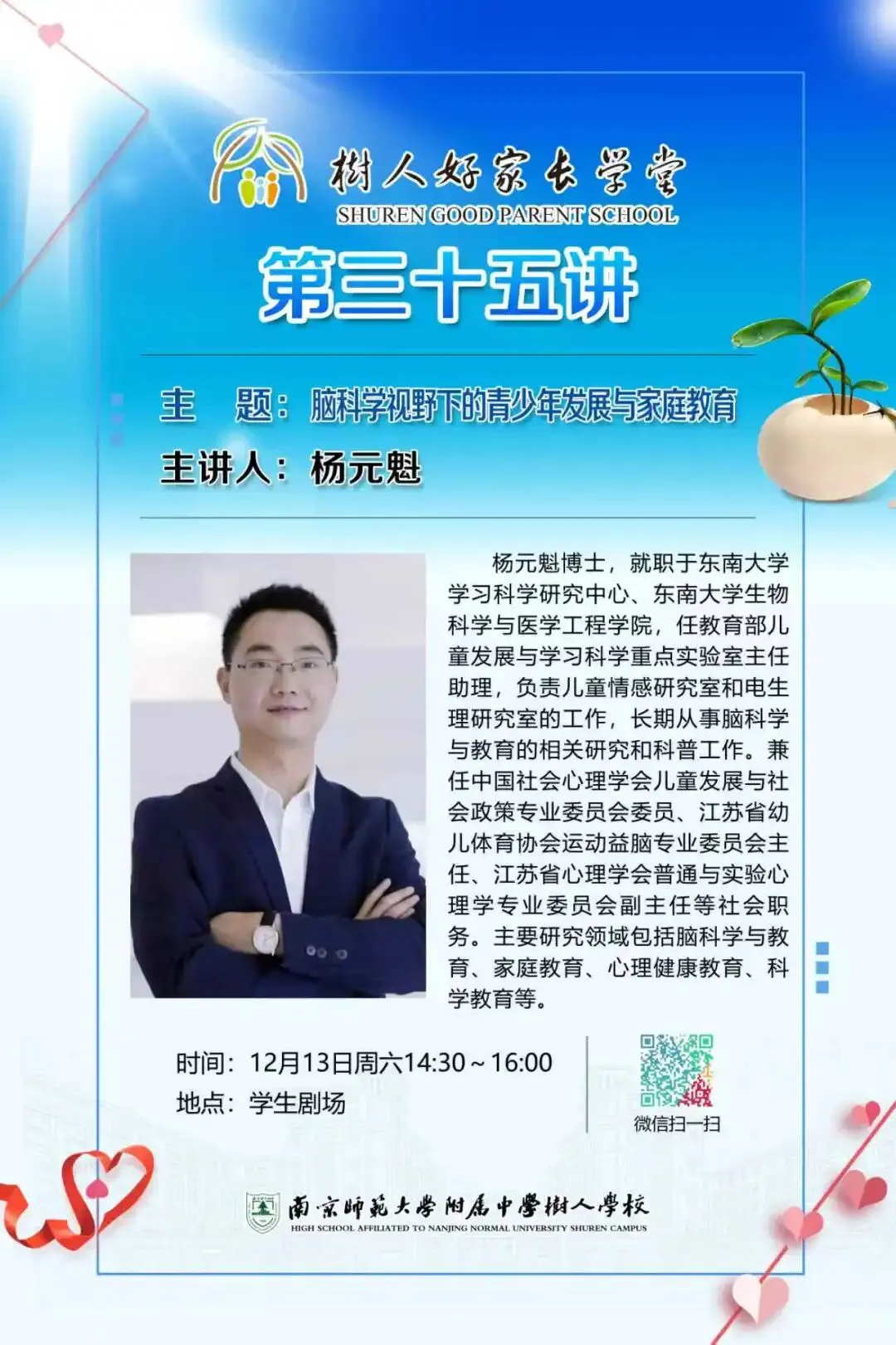 本学期,树人好家长学堂持续开展系列活动,为家庭教育注入了科学的温度与智慧。肖鹃老师主讲的《智慧陪伴,积极赋能》,从实践层面提供了具体可行的陪伴策略;杨元魁博士则从脑科学视角,帮助家长理解孩子行为背后的心理机制与发展规律。两场讲座分别从“如何陪伴”与“为何如此”两个维度展开,共同搭建起理解孩子、科学陪伴的桥梁,让家庭教育在专业指引中更显从容与温暖。