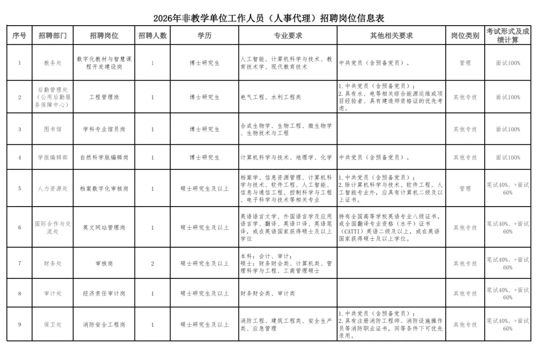 招聘岗位具体情况详见《2026年非教学单位工作人员(人事代理)招聘岗位信息表》。