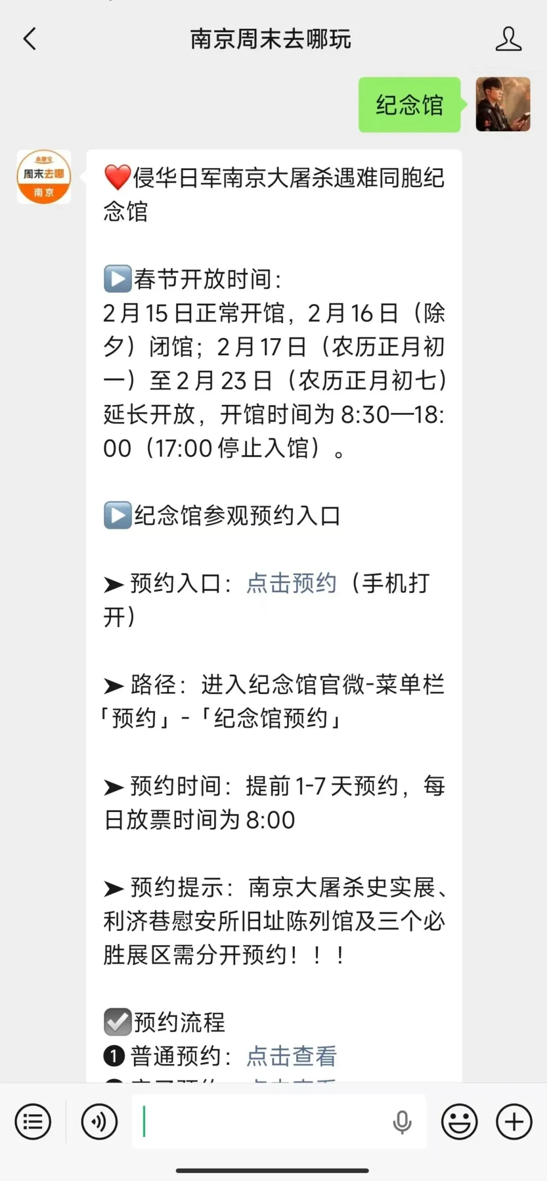 或者扫描下方二维码,关注【南京周末去哪玩】公众号,点击发消息,后台对话框回复【纪念馆】即可获取快捷预约入口、预约攻略以及参观攻略
