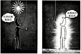 漫画中月牙脑袋的小人先是伸手打开一盏太阳模样的灯,淡然道“打开灯照亮自己”;待到灯被收走,他却在原地化作光源,“点亮自己发出光”。比较这两幅简单的画面,我们恍然:终其一生,我们都在完成从“借光”到“发光”的觉醒——借光不可久, 发光不可量。