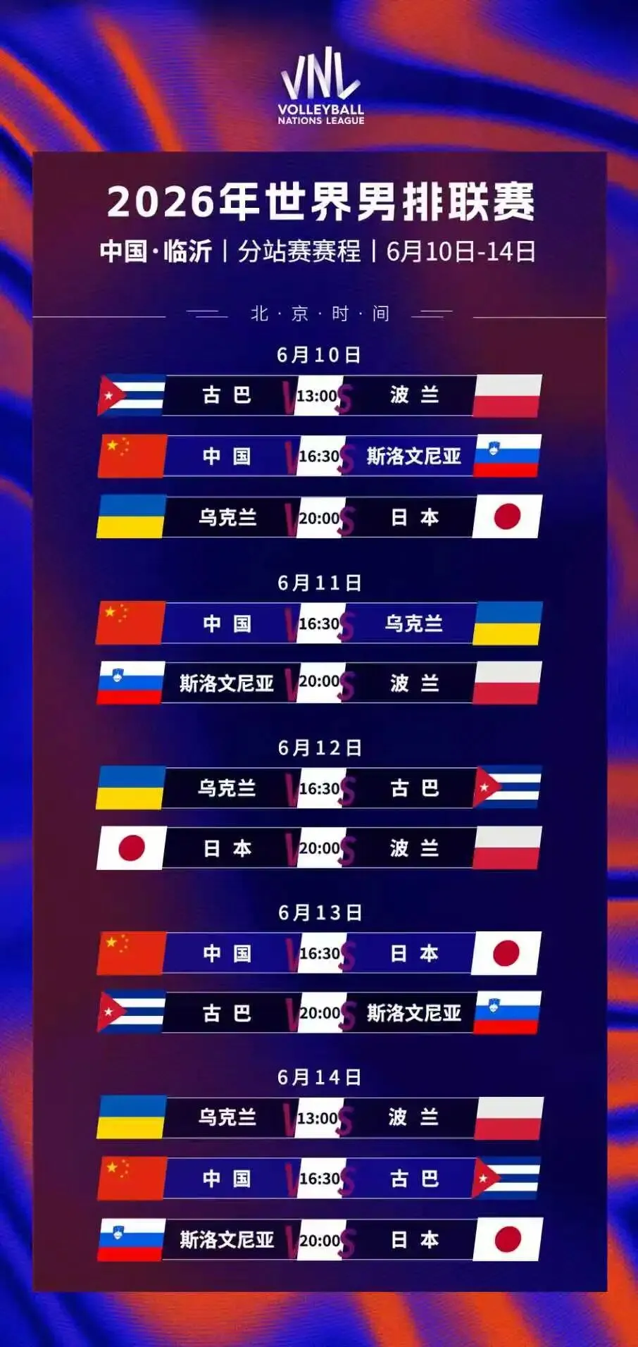 6月10日至6月14日,中国男排将在临沂奥体公园体育馆先后迎战斯洛文尼亚、乌克兰、日本、古巴。