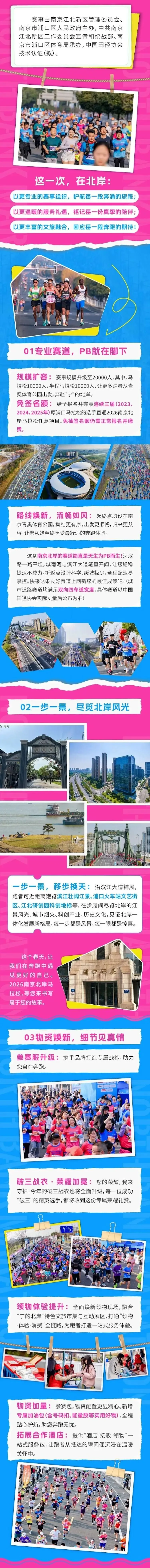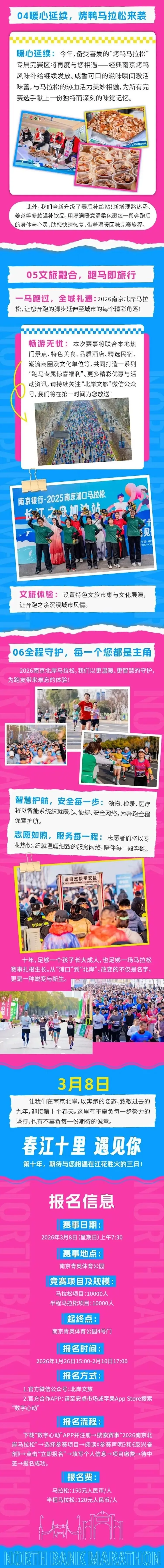 2026南京北岸马拉松定于3月8日(周日)7:30在南京青奥体育公园4号门开跑,赛事规模20000人,设马拉松(42.195公里)10000人、半程马拉松(21.0975公里)10000人两个项目;1月26日15:00-2月10日17:00开放预报名及缴费,2月中下旬公布抽签结果,未中签选手将全额退还报名费。
