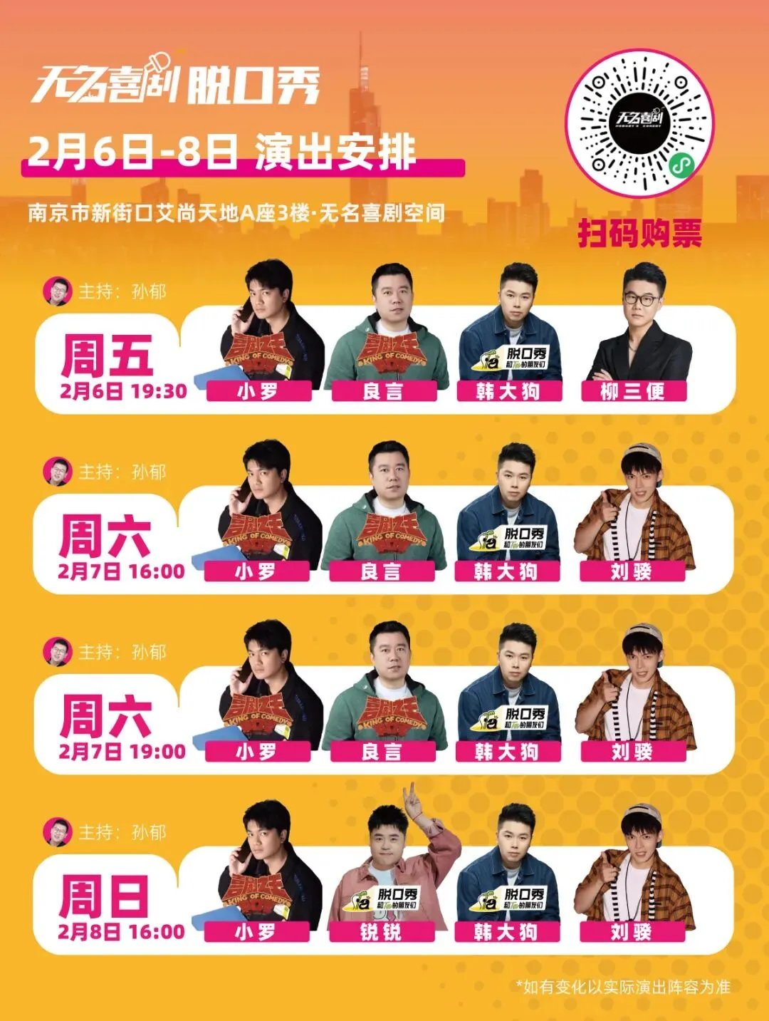 2月7日周六两场时间为 16:00/19:00,2月8日周日时间为 16:00,购票的朋友在无名喜剧空间一起欢聚!我们剧场见。