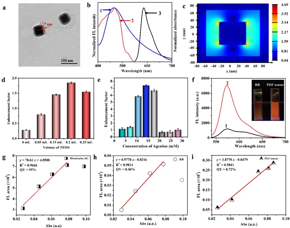 Scheme 1展示了传感器的构建过程:Agcubes作为基底,硅壳作为刚性间隔层,RB通过酰胺反应固定在氨基功能化表面。通过3D-FDTD模拟,Agcubes的尖锐边缘产生局部电场热点(强度达4.67 V/m),与RB的激发光谱重叠,从而增强光吸收。实验优化中,使用14.1 mM Agcubes和0.20 mL TEOS时,荧光增强达7.4倍(p<0.05),而过高浓度会导致淬灭。