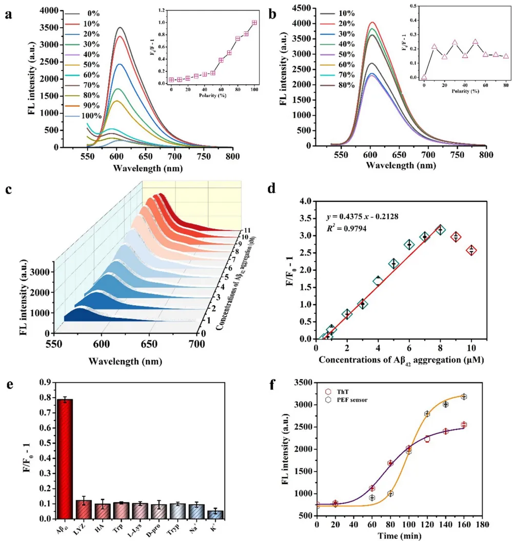与传统电化学方法相比,该传感器虽检测限稍高,但具备实时原位监测能力,且稳定性优异(在含血清培养基中10天荧光强度保持稳定)。研究为蛋白聚集基础研究和AD临床诊断提供了新思路。