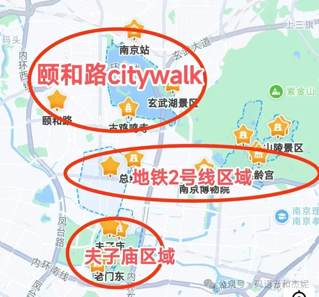 本期内容是南京旅游攻略,这个是南京的主要景点分布,大概可以分成三个区域;地铁2号线区域,夫子庙区域,还有颐和路citywalk,分别介绍一下: