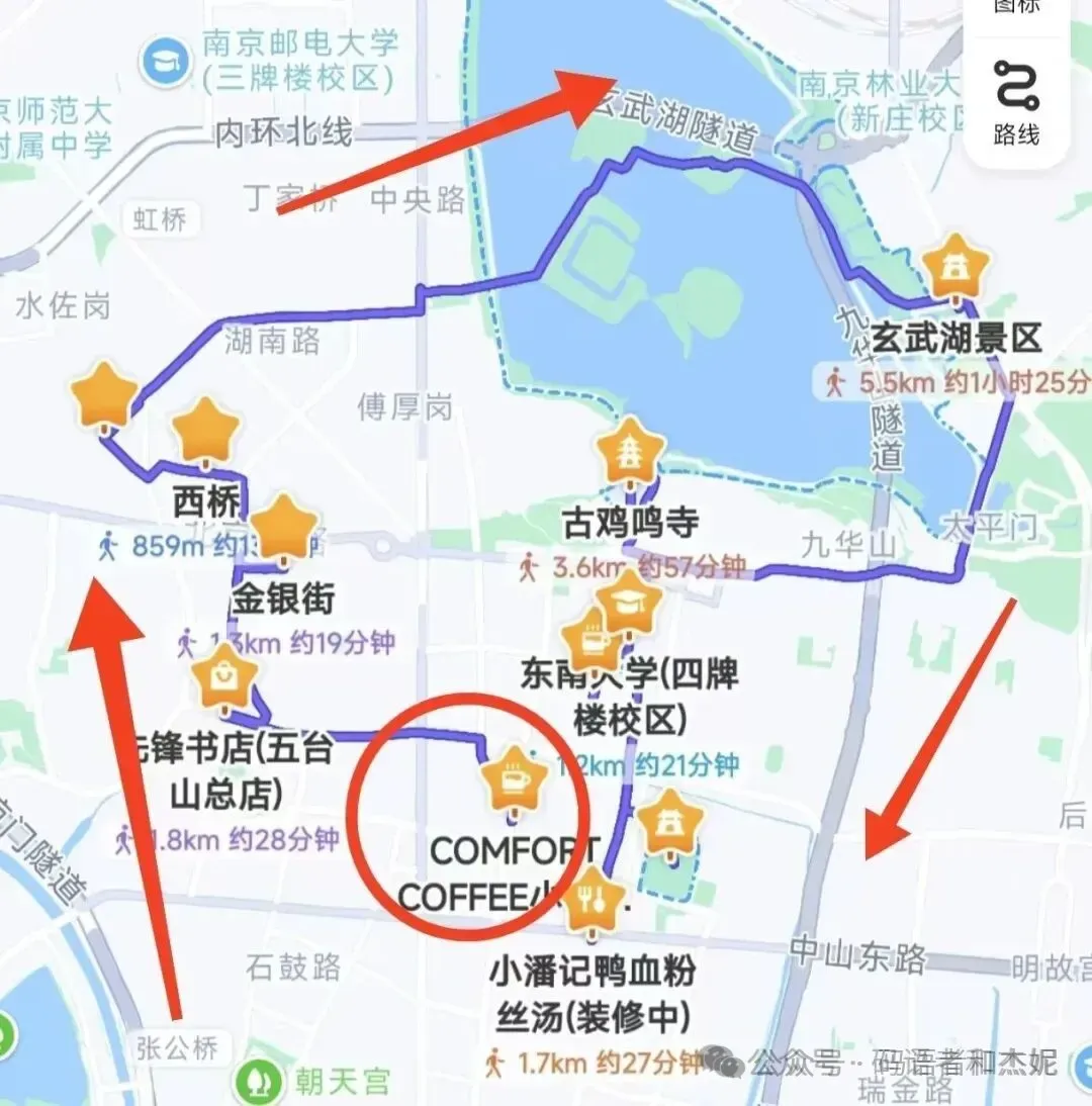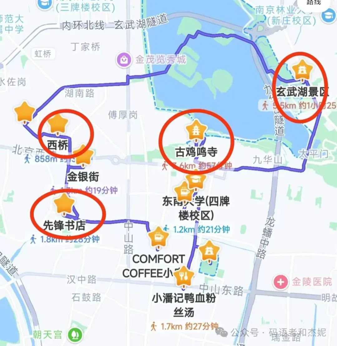 这条路线路很长,也包括了玄武湖区域,如果有时间就走整个环线,如果时间紧张,那就把重点景点去了,我也做了标注啊。另外景点之间,我也标注了距离和时间,可以根据自己情况,走路骑车或是坐车。