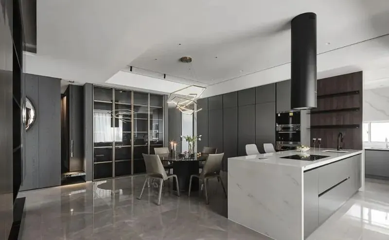 2 厨房是开放式的,橱柜一眼望到头,做饭的时候不会觉得被堵住,旁边有个岛台,直接做早餐,一边吃一边看夜景,真的非常舒服,锅碗瓢盆都在隐藏柜里,我找半天找不到垃圾桶,结果是拉开柜门藏在里面,动线特别顺,晚上做饭基本不出现烟味,他还特别喜欢自己下厨,有时候一边做菜一边放音乐,真的有点羡慕他这种状态。旁边有个超大冰箱,打开一看,根本没塞满,全是零食和饮料,海归生活果然不一样。