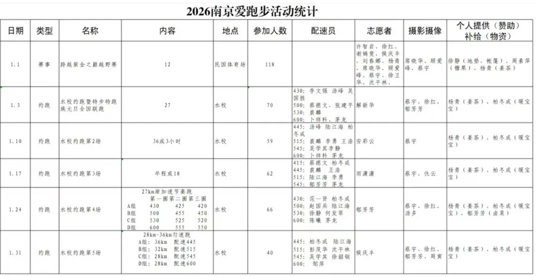2026年1月,南京爱跑步开展6场活动(不含各训练营活动),从初雪覆盖的紫金山顶到零下5度的玄武湖,共计345人次参加。感谢徐红教练制定训练计划;感谢候庆丰等14位志愿者、茅龙等24位配速员的付出;感谢杨青等5位跑友无偿提供的各类补给、物资;感谢郁芳芳等8位跑友随行摄影摄像。